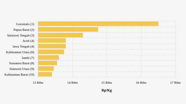 Harga gula pasir lokal harian di pasar modern Gorontalo menjadi yang termahal se-Indonesia dengan harga jual Rp 16.500 per kg. Dibandingkan sebulan lalu, harga gula pasir lokal di provinsi ini tidak mengalami perubahan. Harga jual tertinggi yang pernah dicatat di wilayah ini adalah Rp. 21.000 per kg.