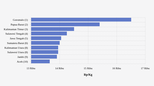 Harga gula pasir lokal harian di pasar modern Gorontalo menjadi yang termahal se-Indonesia dengan harga jual Rp 16.500 per kg. Dibandingkan sebulan lalu, harga gula pasir lokal di provinsi ini tidak mengalami perubahan. Harga jual tertinggi yang pernah dicatat di wilayah ini adalah Rp. 21.000 per kg.