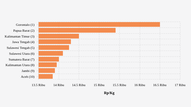 Harga gula pasir lokal harian di pasar modern Gorontalo menjadi yang termahal se-Indonesia dengan harga jual Rp 16.500 per kg. Dibandingkan sebulan lalu, harga gula pasir lokal di provinsi ini tidak mengalami perubahan. Harga jual tertinggi yang pernah dicatat di wilayah ini adalah Rp. 21.000 per kg.